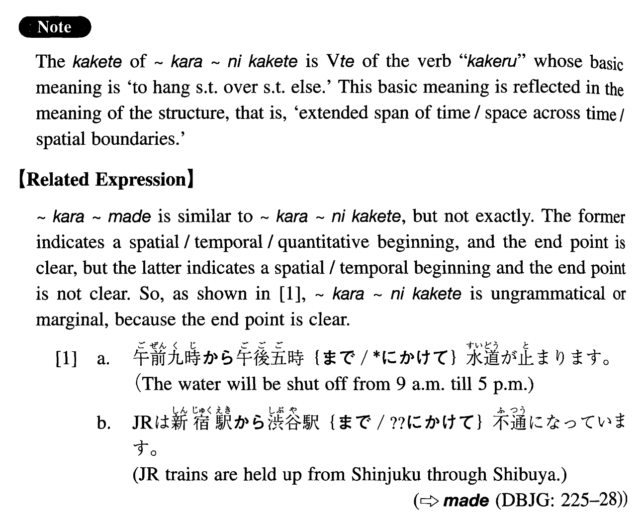 A structure that expresses coverage from one time/location into the other. | Through~ into~; through~ on to; from~ till/tn |
