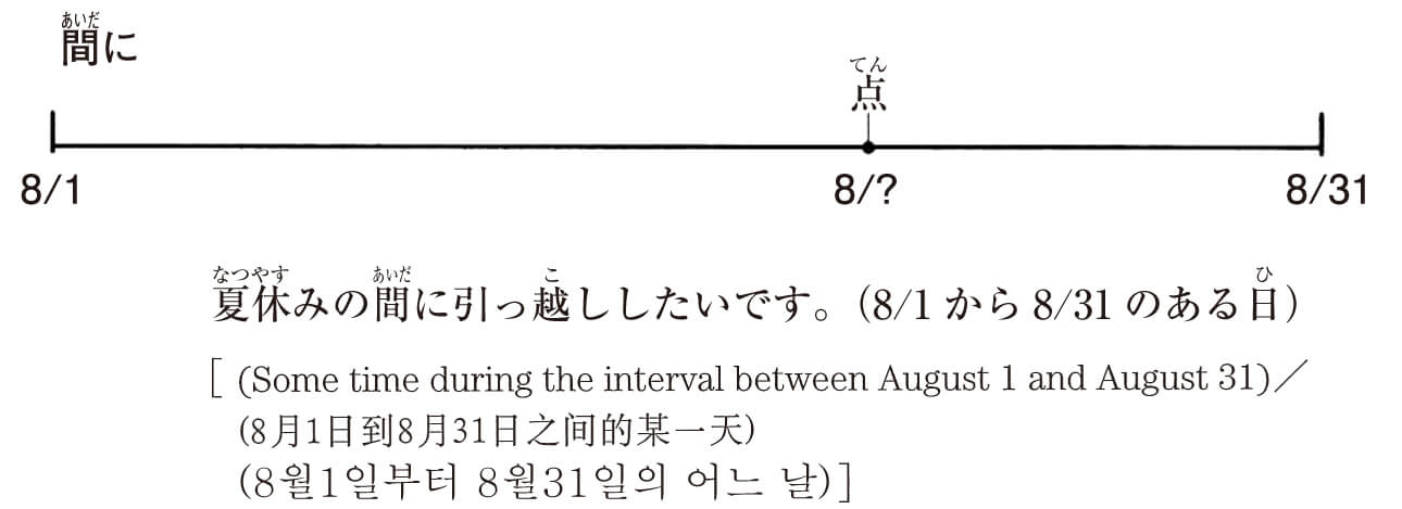 「間に」は時間幅のある状態を表す言葉につながり、「その時間幅が終わる前に」という意味を表す。後には瞬間性のことを言う表現が来る。