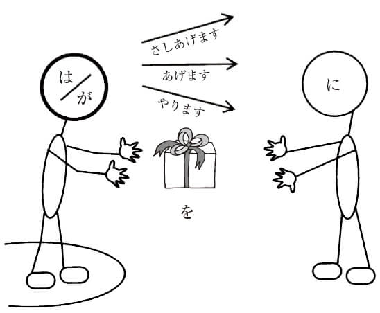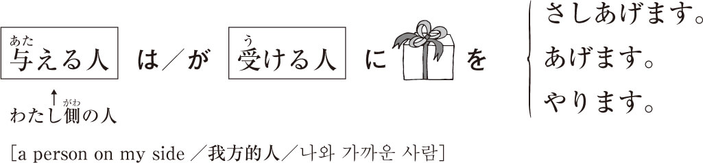 2)The verbさしあげる is used when recipient is socially superior, as in sentences ❸ and ❹ . The verb やる is used toward animals, as in sentence ❺ , and is also used toward one's own family when speaking to people outside of one's inner circle, as in sentence ❻ .