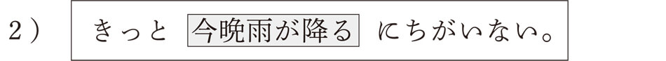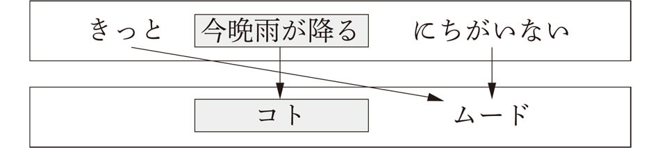 「今晩雨が降る」という事柄の部分について、「きっと……にちがいない」という話者の気持ち(推量)を伝えているわけです。つまり、「今晩雨が降る」という部分は単にそのような出来事を表すために必要な日本語のパーツをつなげているだけで、この出来事に対する話者の気持ちは「きっと……にちがいない」に込められていると言えるわけです。このように、日本語の文は客観的な事柄を表す部分と話者の気持ちを表す部分との2層に分けることができます。客観的な部分をコト、気持ちの部分をムードと呼んでいます。文法書によっては、コトを命題、言表事態、叙述内容、ムードをモダリティ、言表態度、陳述などと呼ぶことがありますが、基本的な考え方は皆同じです。これを図で表すと以下のようになります。