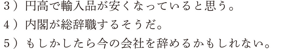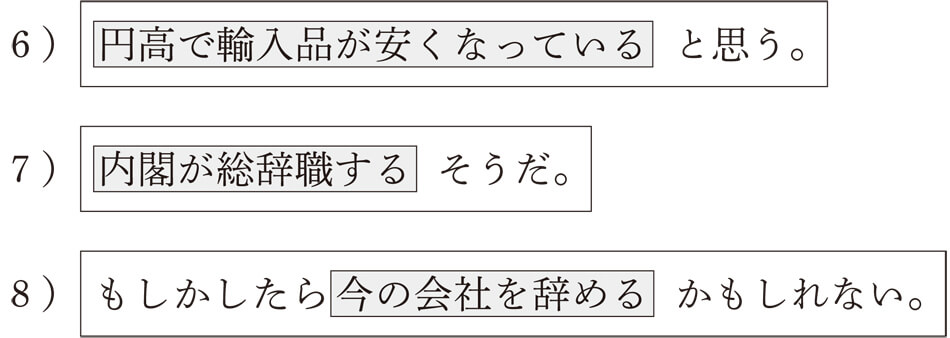 3)は「円高で輸入品が安くなっている」という部分です。したがって、「~と思う」が話者の気持ちを表すムードとなります。4)は、「内閣が総辞職する」ですね。「~そうだ」は伝聞を表すムードの表現です。5)は、「今の会社を辞める」であり、「もしかしたら……かもしれない」がムードの表現ですね。いかがでしょうか。なんとなく、コトとムードという2つの階層が理解できたでしょうか。これらのことをまとめて示すと以下のようになります。
