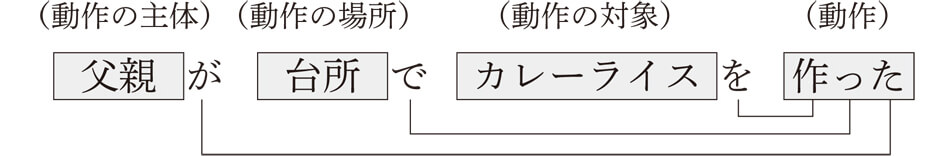 じつは第1章で見た日本語文の基本的な構造はコトを表していたのです。つまり、格助詞は文の成分と述語とをつなげることで、客観的なコトを構成する役割を担っていたわけです。たとえば、「父親が台所でカレーライスを作った」という事柄であれば、次のような構造をしていると考えることができます。