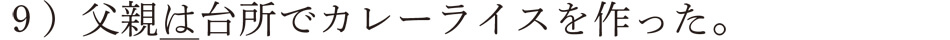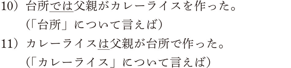 どこに話者の気持ちが表されているんだろうと思うかもしれませんね。たしかに「~は」は使われていますが、話者の気持ちがどのように表現されているのか、わかりにくいですね。じつは、「父親は」は文の主題として提示されているんです。主題というのは、その文のなかで話者が特に話題の中心として聞き手に伝えたいものです。例文9)の文は、「父親について言えば、台所でカレーライスを作った」という意味合いです。この文では「父親が 台所で カレーライスを 作った」というコトの成分のなかから、「父親が」という成分が文の主題として選ばれ、「~は」で提示されていると考えることができるんですね。ということは、もちろん、その他の成分を主題として提示することも可能ですよ。次の主題文は、「父親が」以外の成分が主題として提示されたものです。