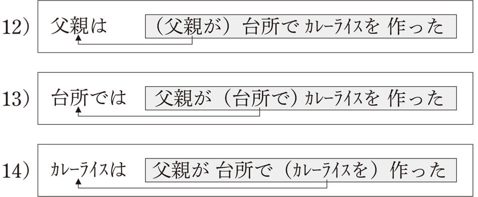 例文9)から例文11)はすべて「父親が 台所で カレーライスを 作った」というコトの成分のなかから、異なる主題が選ばれているわけです。これらのメカニズムをわかりやすく図式化してみましょう。