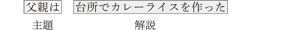 文の主題は「父親は」で、その解説が「台所でカレーライスを作った」ということになるわけです。日本語文の多くはこのような「主題-解説」という構造であり、学校文法で教えられる「主語-述語」の関係ではありません。主述関係はあくまでコトのなかでの関係の一つであり、日本語文を正しく説明できないというのは、こういう理由からなんですね。学校文法でいう主語というのは、主題化された文で言えば、例文9)の「父親」だけであり、例文10)の「台所」も、例文11)の「カレーライス」もいずれも主語ではないからです。したがって、日本語文は「主語-述語」の関係ではなく、「主題-解説」という関係が基本となっていると言えるわけです。