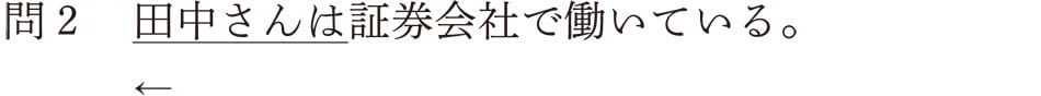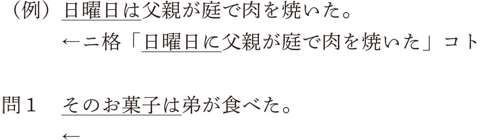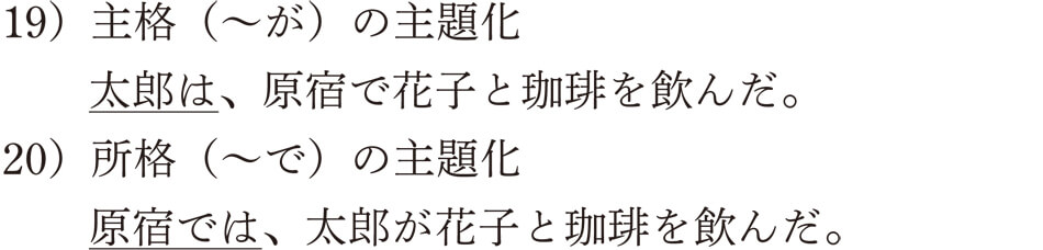 日本語文の基本的な関係は「主題-解説」であることが理解できたでしょうか。では、問題をやりながら、主題化に対する理解を深めていきましょう。次に見る日本語文の主題はどのようなコトの成分から選ばれ、提示されたものでしょうか。(例)にならい、主題化される前の格助詞の種類(ガ格、ヲ格、ニ格、デ格、ト格)で答えてください。なお、主題のなかには、例文10)の「台所では」のように、格助詞と一緒に主題化されるものもあります。