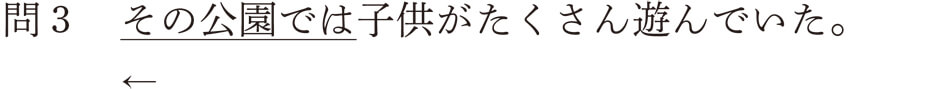 この問題は簡単ですね。「~は」と一緒に「~で」が現れているからです。「子供が その公園で たくさん 遊んでいた」というコトのなかから「その公園で」が主題として提示されています。したがって、答えはデ格となります。