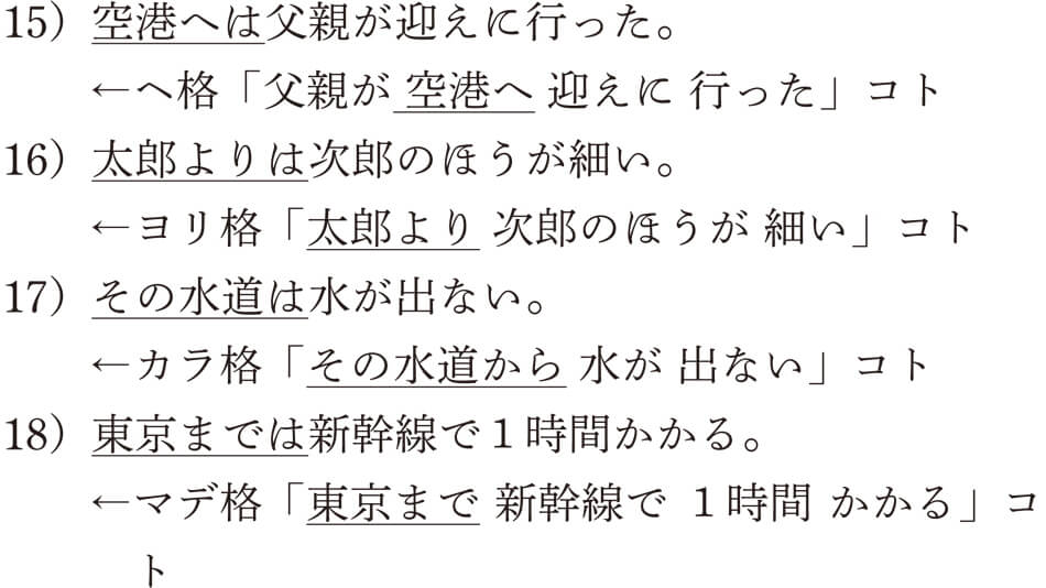 いかがでしたでしょうか。すべて正解できたでしょうか。この練習問題では、9つある格助詞のなかからヲ格、ガ格、デ格、ニ格、ト格が主題化される例文を見ましたが、その他の格助詞であるヘ格、ヨリ格、カラ格、マデ格も主題化することができます。以下に、その例文を挙げておきますね。
