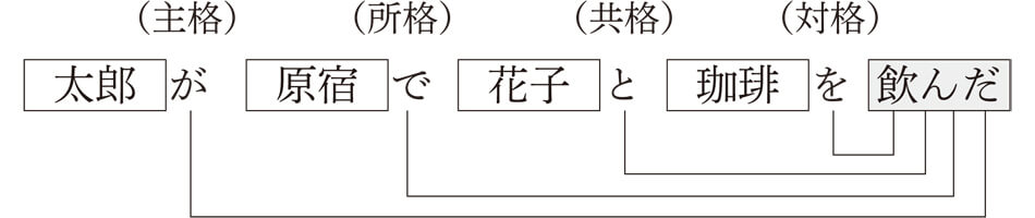 では、「主語廃止論」は世の中から否定されたのかというと、決してそんなことはなく、反対に三上さんの考えは大多数の日本語研究者に支持されているんです。では、なぜ「主語」はなくならなかったのかと思いませんか。そうなんですね、たしかに三上さんの主張するように、欧米語に見られる「主語-述語」という関係の上に成り立つ「主語」の存在は日本語にはありません。これは、読者の方ももうおわかりですよね。日本語にあるのは、コトを構成するガ格成分で、本書では「主語」と呼んでいますが、三上さんは「主語」でなく、「主格」と呼べと言ったんです。「主語」と呼ぶと、欧米語の「主語」を想像するため紛らわしいので、いっそのこと、「主語」という言葉をなくし、「主格」にしたほうがいいというわけなんですね。この「主格」という言葉は述語との格関係を示す言語学用語なんです。わかりやすく説明しますので、以下の図をご覧になってください。