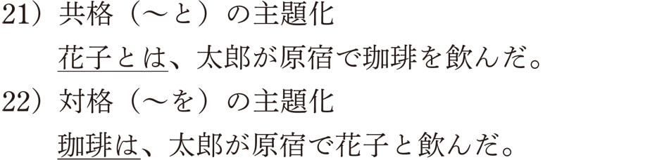 以上の練習から、日本語の主題は、コトの成分のなかから話者によって選ばれたものであることが理解できたでしょうか。学校文法で教える主語と述語の関係はコトのなかにおける結びつきの一つであり、主題化された日本語文を正しく説明できないんですね。また、日本語文法で主語を特別な存在とはみなさない理由は、主語でなくても、格成分(格助詞のついた成分)であれば、どの成分でも平等に主題として提示することができるからです。主語を特別扱いしないというのは、こういうことなんですね。