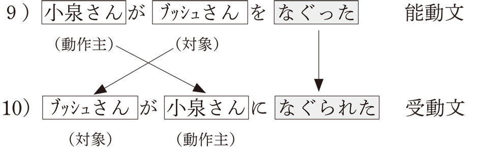 パーツとしては、「小泉さん」と「ブッシュさん」と「なぐった」でしたね。これを入れ替え、助詞と動詞を修正することで、受身文はできあがりました。具体的には、「ブッシュさん」はヲ格からガ格へ、「小泉さん」はガ格からニ格へ、「なぐった」は「なぐられた」という受身形に変わったわけです。したがって、ブッシュさんは小泉さんから直接影響を受けているという意味で、直接受身文と呼ばれるわけなんです。