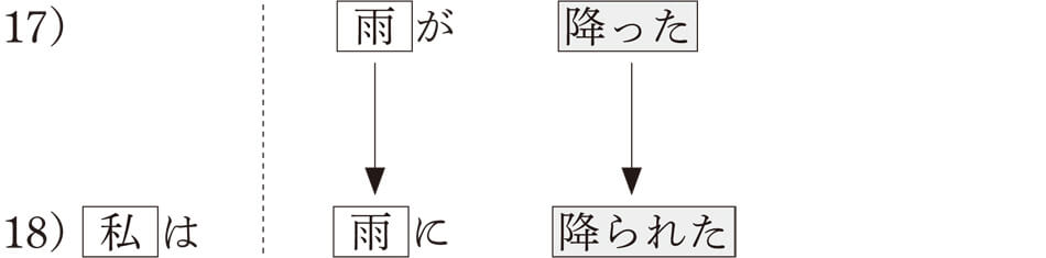 もう少しわかりやすく説明しますね。この文の意味するところは、「ブッシュ夫人であるローラさんは、『小泉さんがブッシュさんをなぐった』という出来事によって影響を受けた」という文なんです。つまり、ある出来事が起きることで、間接的に影響を受ける人を主役にするのが間接受身文なんです。直接受身文では主役の入れ替えが必要でしたので、必ず目的語がなければ作れませんでした。動作主が主役なのか、対象が主役なのかという選択ですね。ところが、間接受身文では、出来事がそのまま受け入れられますので、目的語のあるなしはまったく関係がないんですね。ということは、自動詞の出来事でも受身文が可能になるわけです。これが、英語などの他言語と非常に異なるところです。たとえば、仕事帰りに突然雨が降ってきて困ったりすることがありますね。このような場合、「雨が降った」という自然現象によって受けた影響を、「仕事帰りに突然雨に降られて、困ったよ」などと言うことができるんですね。