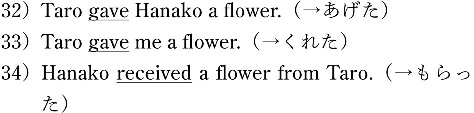 「やりもらい動詞」の使い方には複雑な要素がありますが、ここではシンプルに考えてみることにしましょう。この3つの動詞は英語で言うと、“give”か“receive”のどちらかになります。「あげる」は“give”で、「もらう」は“receive”ですが、では、「くれる」はどちらになるでしょうか。ちょっと考えると、花をもらうのは自分ですので、“receive”と考えがちですが、じつは“give”なんです。上の例文を英語に直すと、わかりやすいので見てください。