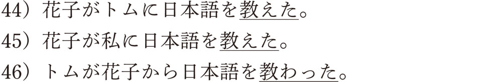 まず、例文41)から考えましょう。この文の事実は、「花子がトムに日本語を教えた」ということですね。それで、どうして、「~てあげる」が使われているかということですが、日本語ではこの事実を、「花子が『日本語を教える』という思いやりをトムにあげた」と考えるわけです。これをわかりやすく示すとこんな感じです。