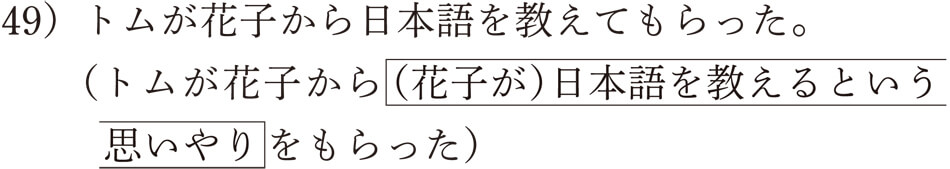 本書では「思いやり」という言葉を使っていますが、文法書によっては、「恩恵のやりもらい」や「好意のやりもらい」などと言うこともあります。でも、「思いやり」と言うほうが日本人の心を表していて、私にはぴったりだと思えるんですが、いかがでしょうか。