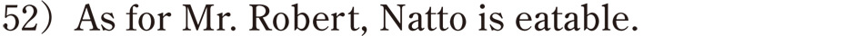例文50)では、ロバートさんが主題であり主語でもありますね。主語と主題については、すでにお話ししましたが、もう一度説明しますね。この文は「ロバートさんが納豆を食べる」というコト(事実の部分)から、「ロバートさんが」という主語が主題化されたものです。したがって、「ロバートさんは」は主語でもあり、主題でもあると言えるわけです。「ロバートさんについて言えば、納豆を食べる」という意味ですね。それに対し、例文51)では、「ロバートさんに納豆が食べられる」というコトから、「ロバートさんに」が主題化されていると考えることができます。ということは、主語は「納豆」ですね。つまり、可能形の主語は、実現が問われる事柄になっているんです。英語では一般的に“can”を使って日本語の可能構文を、“Mr. Robert can eat Natto”などと訳しますが、アルフォンソさんという有名な日本語研究家は、このような日本的な表現をそのまま、英語に翻訳し、そのニュアンスを学習者に伝えようとしました。