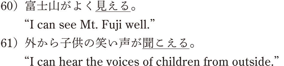 次に、自発形もまた、このような日本人の物事に対するとらえ方を表しています。自発形は出来事が自然に発生することを表す形式ですが、その数自体はそれほど多くはありませんが、日常的によく使われる自発動詞に、「見える」と「聞こえる」があります。
