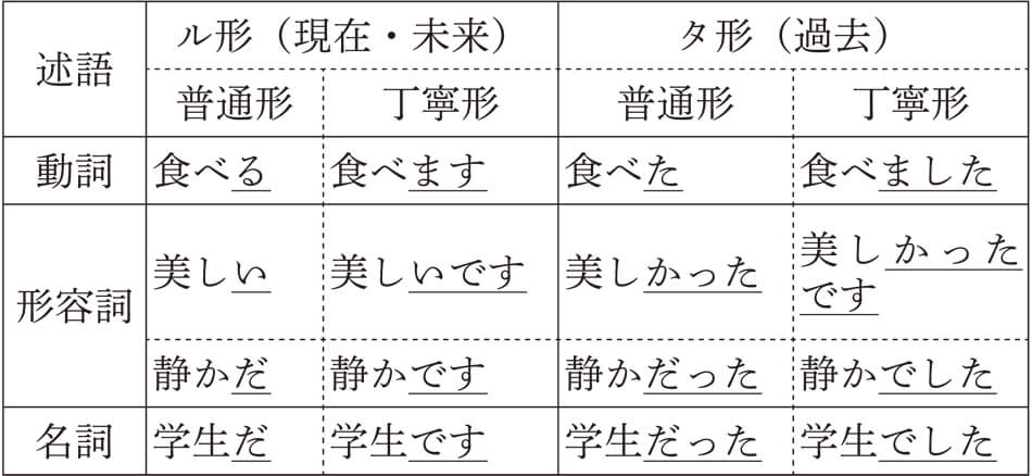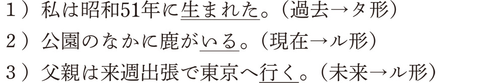 これらの表現の下線を引いた部分によってル形とタ形になるのですが、子音動詞(五段動詞)にはルやタで終わらないものがたくさんあります。たとえば、ル形であれば、「書く」「貸す」「立つ」「死ぬ」「読む」「買う」「飛ぶ」「騒ぐ」など、タ形であれば、「読んだ」「泳いだ」などです。要するに、普通形であれ、丁寧形であれ、述語の言い切りのかたちがル形またはタ形であると思っていただければけっこうです。