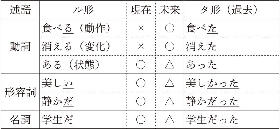 以上でテンスは終わりです。このテンスが述語の最後につくことで、文の骨格であるコトが完成します。このコトをどのように聞き手に伝えるのかというのが、次章で説明するムードになります。