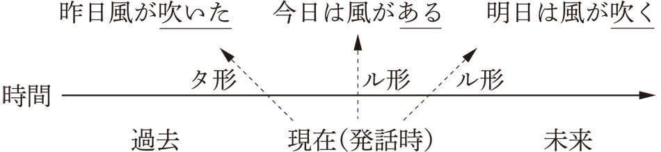 テンスはコトを形成する述語の一番後に現れる形式です。ボイスとアスペクトは動詞にしか現れませんでしたが、テンスはすべての述語に現れます。時間軸のなかで、述語が表す事態が過去に起きたか、現在起きているか、未来に起きるかを表します。私たちが過去、現在、未来と言うとき、それは話をするときを基準に考えています。この基準点を発話時と呼びます。私たちは、この「発話時」を基準に、それより前の事態であればタ形、同時またはそれより後の事態であればル形を使っているんですね。