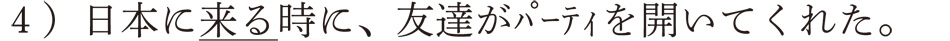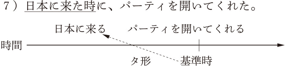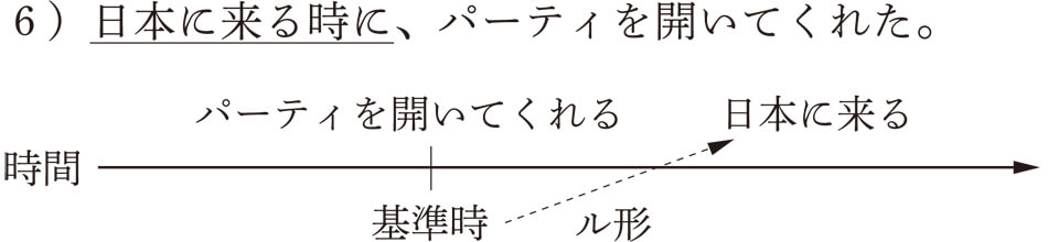 つまり、「日本に来る」という従属節は、「パーティを開いてくれる」という主節のときより、後に起きることなので、ル形が使われているということなんです。でも、日本に友達がいて、日本に着いたら、友人が集まってパーティを開いてくれたなんてことも考えられますね。そうすると、今度は「日本に来た時に、友達がパーティを開いてくれた」と言えるわけです。この場合、パーティを開いたときにはすでに日本に来ているわけですので、タ形になると考えられるのです。