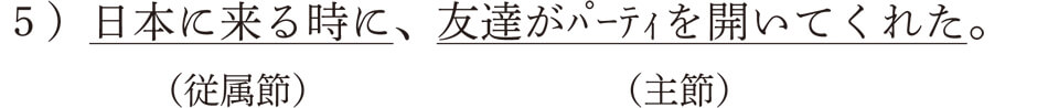 まず、相対テンスが現れるのは、2つ以上の文からできた文、これを複文と呼びますが、この複文に限られるということです。さっきの例文で言えば、「日本に来る(時に)」という文と「友達がパーティを開いてくれた」という2つの文があったでしょう。文のなかに文があるというのも変ですから、文のなかの文は節と呼ばれます。つまり、2つの節からできた文が複文ということになるわけです。この2つの節のなかで、主となる節を主節、従となる節を従属節と呼びます。先ほどの例文であれば、「日本に来る(時に)」が従属節で、「友達がパーティを開いてくれた」が主節となります。どっちが主節でどっちが従属節かわからない? そう思う人もいるかもしれませんね。でも、大丈夫です。日本語の複文では必ず後の文が主節となります。ですから、相対テンスが現れるのは必ず前の節(従属節)なんですね。主節には現れません。なぜかというと、主節は文全体の出来事を表しますので、それが、過去なのか、現在なのか、未来なのかを明らかにする必要があるからなんですね。ですから、「友達がパーティを開いてくれた」と、主節にタ形が使われているのは、この出来事全体が過去に起きたことを示しているわけです。