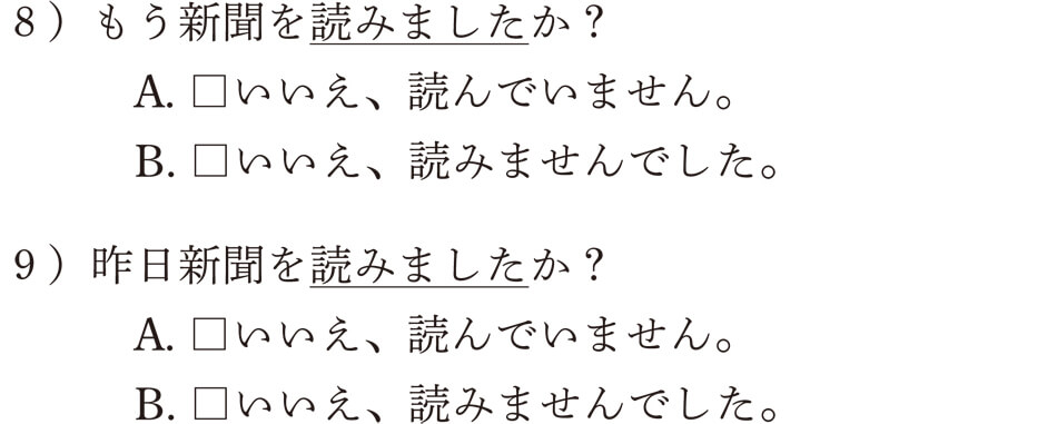 8)ならAを、9)ならBを選んだはずです。不思議ですよね。両方とも「読みましたか?」と聞かれているのに、なぜ答えが異なってくるのでしょうか。じつは「読みました」と同じタ形が使われていますが、8)の「読みました」は現在完了形で、9)の「読みました」は過去形なのです。この「現在完了」という言葉、中学校の英語の教科書に出てきたものですね。ちょっと思い出してもらうためにも、この8)、9)の例文を英文にしてみましょう。