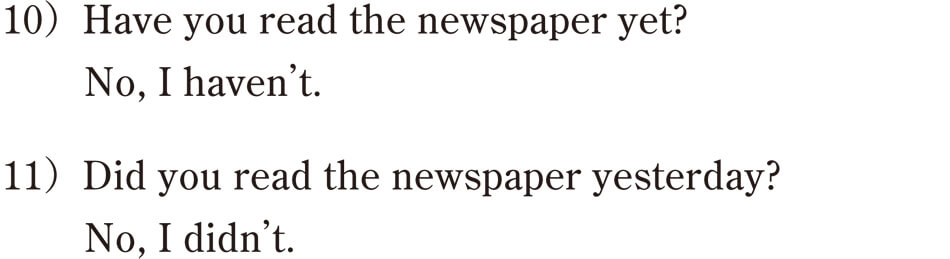 、そのような行為があったかどうかを質問しているわけです。現在とのつながりの有無によって、現在完了形か過去形かに分かれるわけです。ただ、肯定形では両者とも「はい、新聞を読みました」と同じかたちになりますので、否定形にならないと両者の違いははっきりわかりません。現在完了形では、「もう」「すでに」「今」「ちょうど」など、現在とのつながりを示す副詞などと共起するのが特徴です。過去形では、「昨日」「去年」「2年前」「さっき」など、過去の時点を示す表現が使われます。