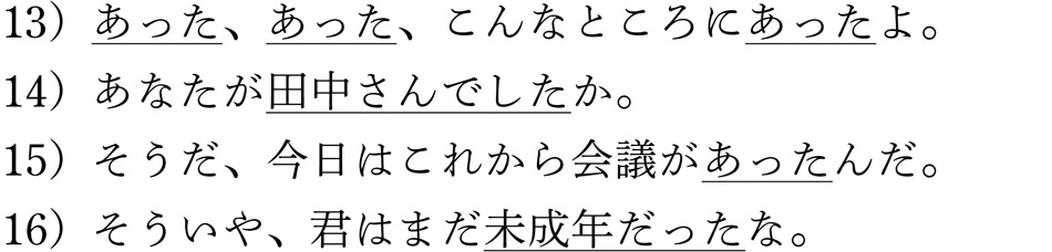 13)は、本当なら「ある、ある」となるべきでしょう。探していたものが出てきたときに使う決まり文句ですね。「発見のタ」と呼ばれます。14)は、田中さんが誰なのかわからなくて、その疑問が解けたときなどに使いますね。その意味で、「発見のタ」と似ています。15)は、忘れていたことを思い出したときに使われますね。「想起のタ」と言われます。16)は、知っていることを確認するときに使われる「確認のタ」です。接客場面でよく使われる「ご注文は以上でよろしかったでしょうか」なども、以前に了解したことを確認しているわけです。間違った接客敬語であると批判されることもありますが、一度聞いたことを確認するために使っていると考えれば、決して間違った使い方ではないんですね。