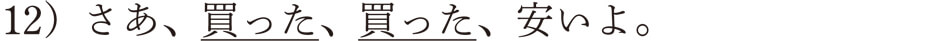 八百屋か魚屋の店先で威勢のいい店員が大声で叫んでいる様子が目に浮かぶようですね。でもよく考えたら、この「買った」という表現、変ですよね。だって、まだ買ってないんですから。過去形でもないし、完了形でもないですね。複文でもないですから、相対テンスでも説明できません。じつは、この「買った」は、「買う」という行為がすでに実現したとすることで、相手を促す効果があるんですね。その他にも、「どいた、どいた!」や「食った、食った!」「飲んだ、飲んだ!」なんて、皆さんも使ったことがあるんじゃないでしょうか。このような表現は、私たちの認識と深く関わっていることから、話者の気持ちを表すムードの表現であると主張する学者もいます。この一風変わったタ形は、上に見るような相手を促すとき以外にも、まだまだあるんですよ。どれもこれも普段の生活でよく使っている表現ばかりです。