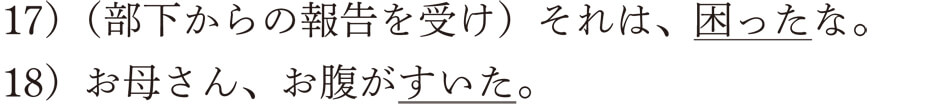 17)は、部下からの報告に困っている様子を、18)はお腹がすいている状態を表しています。いずれもタ形でありながら過去の事態を表しているのではなく、現在の心の状態を表しています。この種の動詞の数はそれほど多くありませんが、日常的な表現によく使われるのが特徴です。その他にも、「あきれた」「安心した」「びっくりした」「驚いた」「ほっとした」「疲れた」「しびれた」「(のどが)渇いた」「(腹が)減った」などがあります。