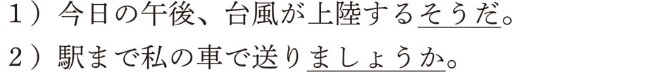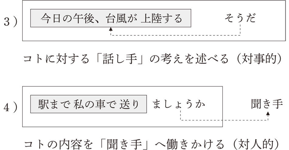 1)の例では、ムードの表現は「~そうだ」ですね。「今日の午後、台風が上陸する」というコトについて、その事実を聞いたことがある(伝聞)という話し手の考えを伝えています。コトに対する判断になるわけですから、対事的ムードになります。2)では、「駅まで私の車で送り(る)」というコトを「~ましょうか」という表現(誘いかけ)で聞き手に働きかけていますね。したがって、対人的ムードになるわけです。