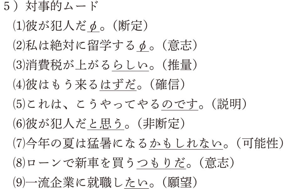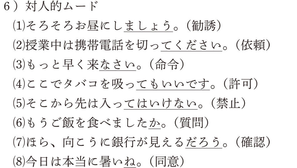 の意志のムードである「~φ」はゼロを表す言語学の記号です。つまり、表面的に何も見えなくても、実際には「断定」や「意志」のムードがあるという意味です。詳しくは、この後で説明しますね。次に、対人的ムードの例を挙げます。