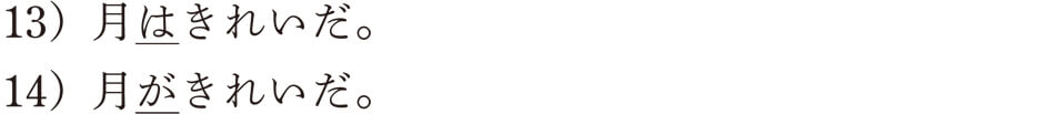 いかがでしょうか。想像することができたでしょうか。では、うまくイメージできた人もできなかった人も、一緒に確認していきましょう。まず、例文13)の状況ですが、「月」の一般論を述べている場面がイメージできたでしょうか。「月」は、誰でも知っているごく身近な存在ですね。この文は主題文ですので、そんな「月」を話題にして、「きれいだ」と説明している文なんですね。状況としては、「月」を見ている現場にいる必要はありません。もちろん、その現場にいてもいいのですが、「月」の一般論を述べているのであれば、どこにいてもかまわないんです。天体の話をしているときに他の星とくらべながら、「月は本当にきれいだね」などと言うのも、そのような状況の一つでしょう。