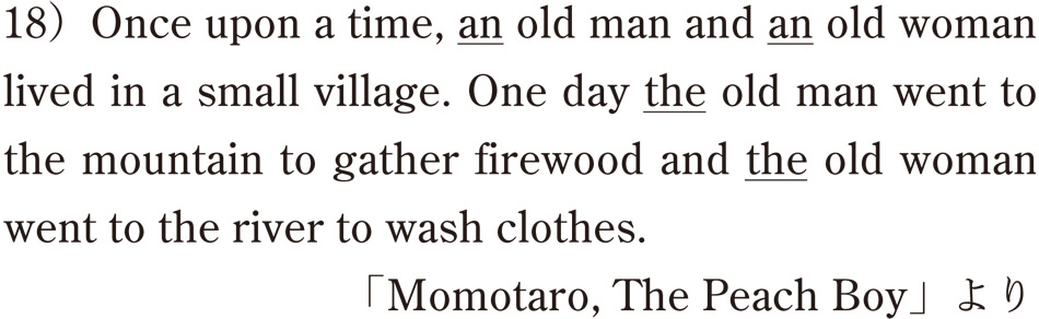 これは、じつは英語の不定冠詞(a/an)と定冠詞(the)の使い方とまったく重なっているんですね。17)の例文を英語にするとこんな具合です。