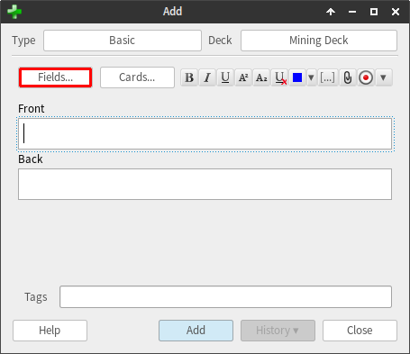 Since all decks must have at least one field, we will first click "Add"