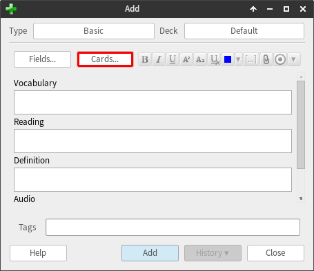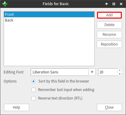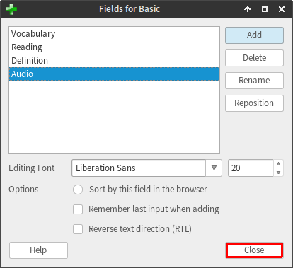 type in "Vocabulary" and then hit "OK". We should now have a field called "Vocabulary" in our deck, so we can go ahead and delete the default fields "Front" and "Back" by selecting them and clicking "Delete". Now repeat the adding process for the other required fields: "Reading", "Definition" and "Audio". Once done, hit "Close".