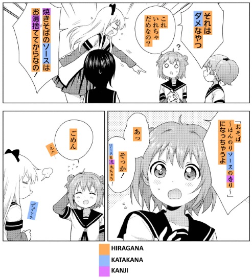 The above is an example from the manga series ゆるゆり using hiragana, katakana and kanji.