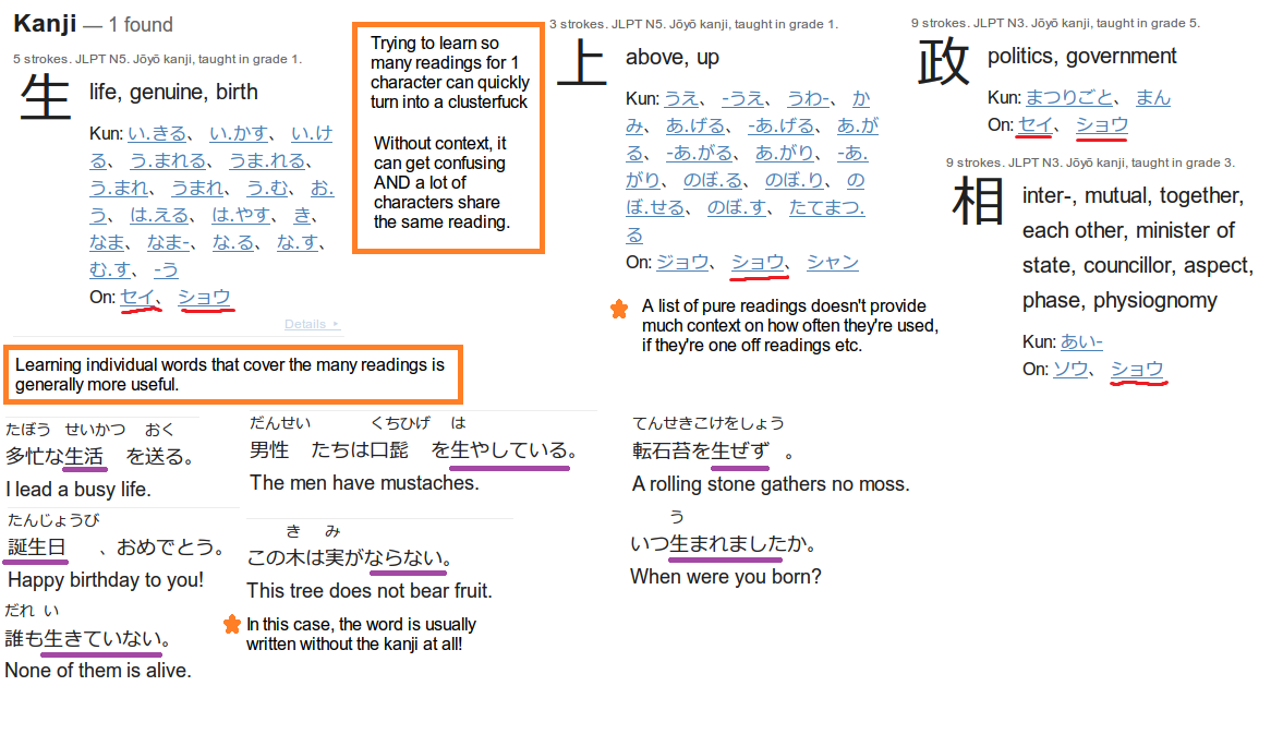 KanjiDamage - Another kanji resource that uses a radical-based order. Unlike Heisig's method it also teaches the readings and gives you examples of common words that use those kanji (great for adding them to your Anki deck right away). Take the introduction on the site with a grain of salt, as it isn't very accurate, or is just plain wrong, as is the case with some other areas on the site, but that in no way makes this a bad resource in regards to learning. You may want to simply use the shared deck for Anki (see library study resources page) instead of the website in tandem with another vocabulary deck in order to build up a big cache of words quickly.