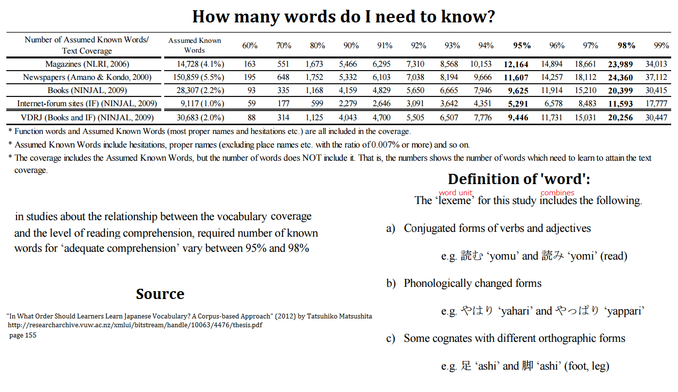 Words only include the dictionary form. Proper nouns and compound words are excluded. For a different study addressing the related question of how many words you need to know to achieve adequate comprehension, see this image. (This won't directly correspond to the number of words you need to learn in Anki, since many words have obvious meanings and readings.)